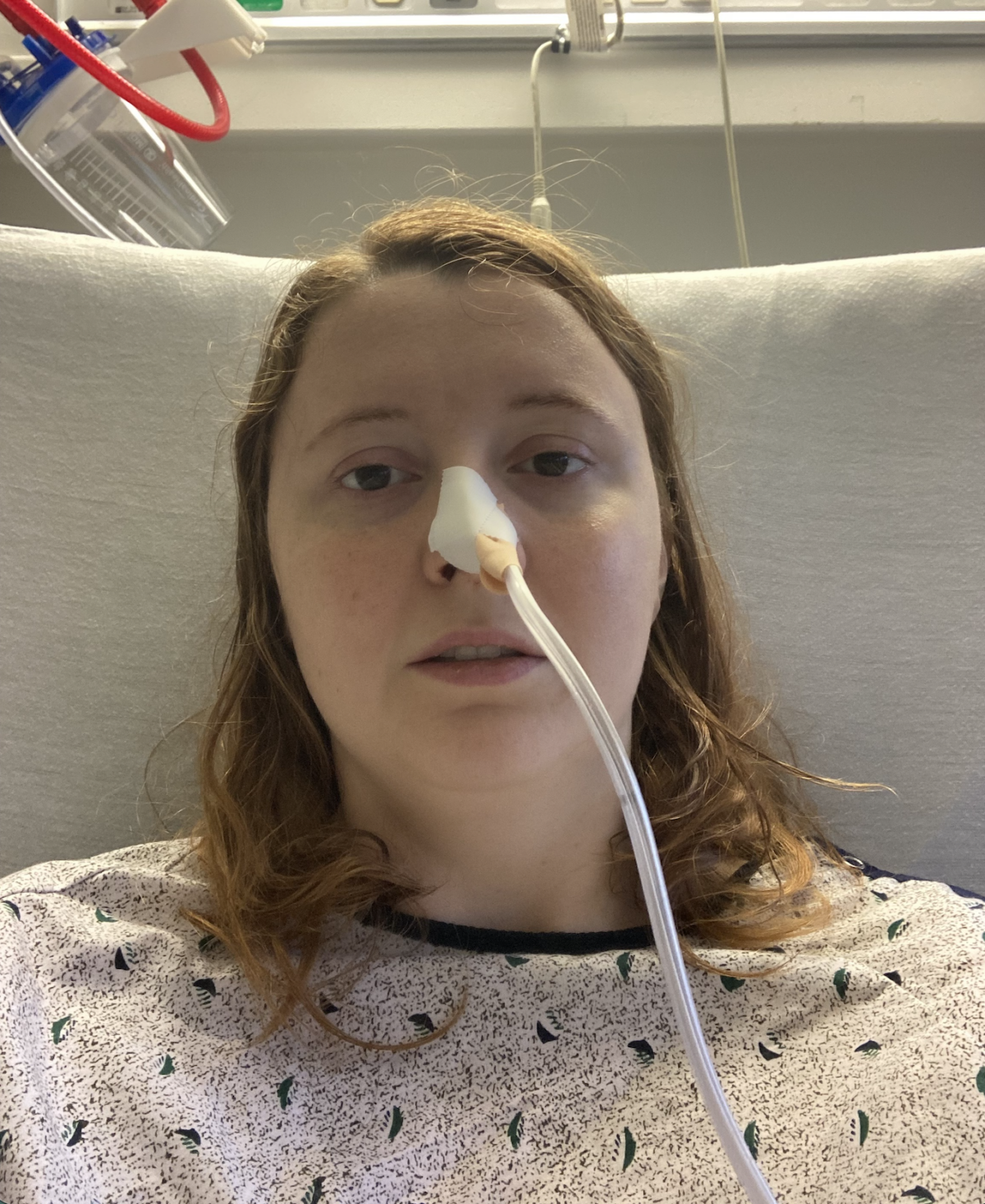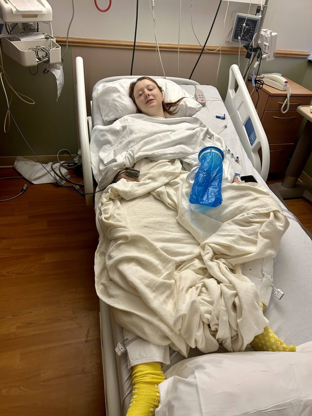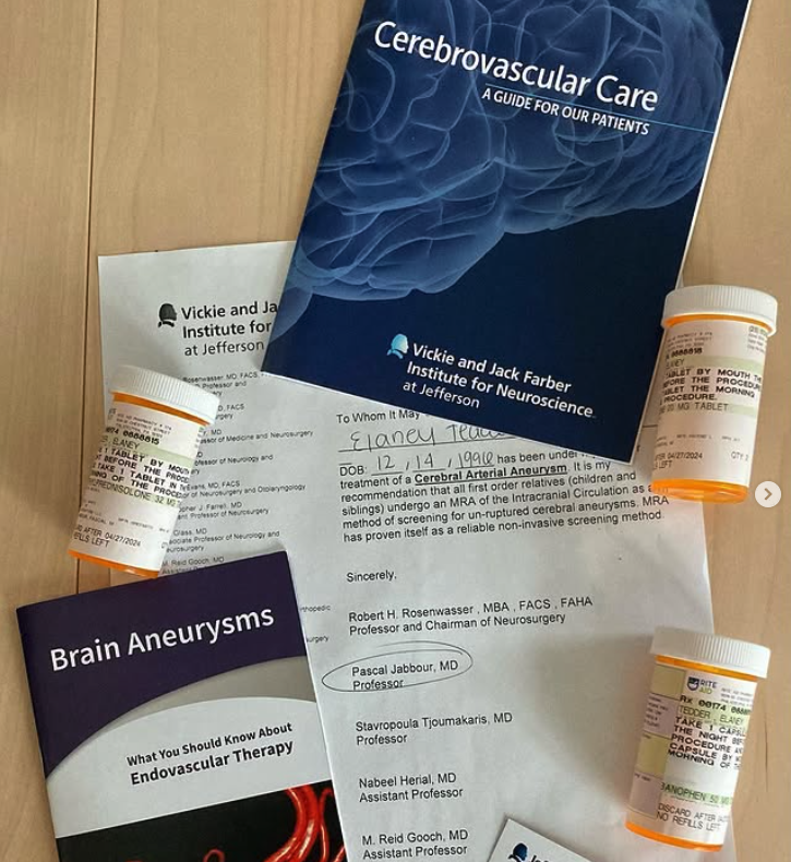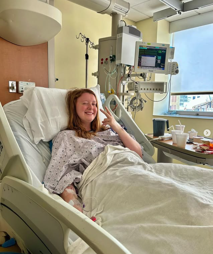 To receive treatment via flow diverter, I had to start dual antiplatelet therapy medications, colloquially known as blood thinners. My antiplatelet medications were Plavix and aspirin, and I needed to take this for 2 weeks before surgery, and 6 months after. The aspirin would stay with me for life. Treatment went well, and I continued to feel well until June 9th, 2023, when I suddenly felt excruciating pain in the lower left quadrant of my abdomen. I went to the emergency room where I was immediately evaluated for ovarian torsion and told I would need emergency surgery to save my ovary. I had so many questions and was so scared – I’m on blood thinners, I’ve had zero time to prepare, my neurosurgeon doesn’t know what’s going on, what will all of this mean? I had no time to ask these questions, as I was taken directly to the OR. I wish I could say the surgery went well, but it began what I call a series of unfortunate events: the cyst on my ovary was hemorrhaging and had to be removed, but the incision wasn’t closed completely and I was bleeding internally; the nurses thought I was fine to stand up immediately after surgery since it was done laparoscopically, but upon standing in the bathroom, I fell backwards and hit my head (on DAPT and with a fresh stent; thankfully no injury); I needed 4 full blood transfusions; and I needed another emergency surgery to stop the bleeding. The second surgery was successful, and after a paralytic ileus and NG tube, I was home a week later.