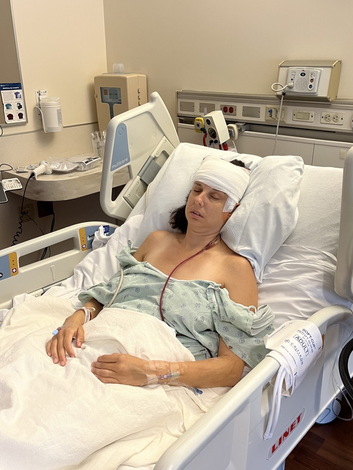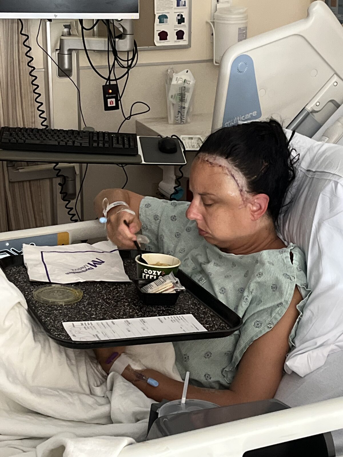 I was wheeled back to my room for monitoring and rest. My pain was managed with Tylenol, along with medications for nausea and seizure prevention. That first day, I barely ate and did get sick. A few hours later, I was finally able to see my husband, and that moment alone brought comfort. My head was wrapped, my face swollen, and my eyes black and blue. I was too afraid to touch my head, though I was desperately curious about how much hair had been shaved.